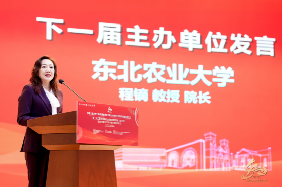会议闭幕式上,举行了会旗交接仪式,推选东北农业大学公共管理与法学院为第二十三届全国高校土地资源管理院长(系主任)联席会暨2026年中国土地科学论坛主办单位。程镝接受会旗,并代表学院发言。她首先祝贺中国人民大学土地管理专业40周年华诞,并感谢联席会主席欧名豪教授及学界同仁在我校土地资源管理专业(原东北农学院土地规划专业)创办70周年之际将联席会交予我院承办。她深情回顾69年前东农前辈怀揣“为沃土立心、为三农铸魂”的初心,在黑土地上播下新中国土地学科的第一粒种子,向全国高校土地资源管理领域同仁发出诚挚邀约,期待2026年相聚哈尔滨、相聚东北农业大学公共管理与法学院,回到土地学科的“初心之地”,共襄学术盛宴、共话学科专业建设。