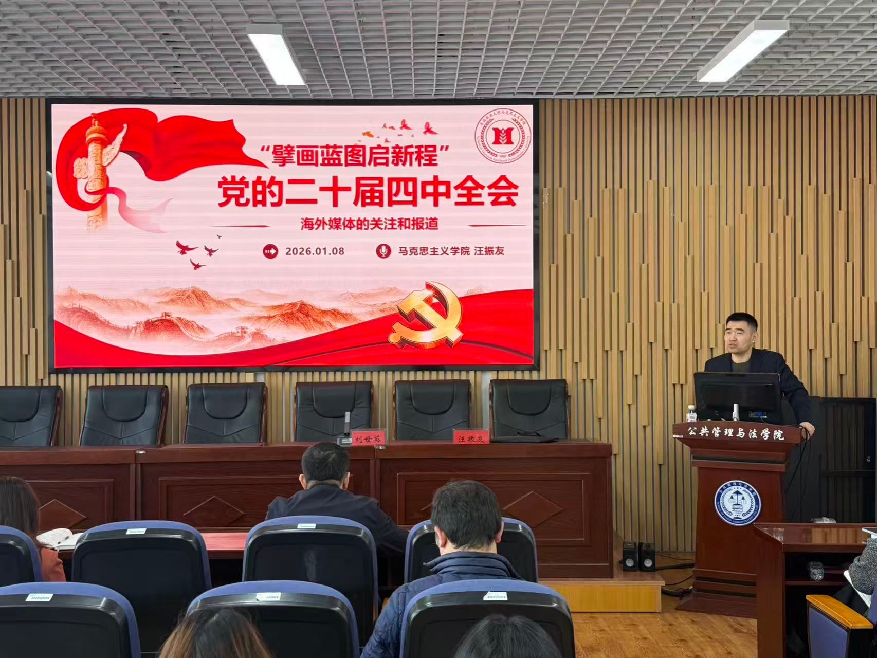 汪振友以《“掣画蓝图启新程”——党的二十届四中全会海外媒体的关注和报道》为题作专题宣讲。他指出,二十届四中全会是我国完成“十四五”主要任务目标,进入基本实现社会主义现代化夯实基础、全面发力的关键时期召开的一次重要会议;随着我国国力提升,海外媒体对全会高度关注,报道呈现理性多元特点,聚焦全面从严治党、科技自立自强等关键议题并给予积极预期。他强调,分析海外报道可拓宽视野,为讲好中国故事、提升国际影响力提供支撑,助力师生深化对全会精神的理解。