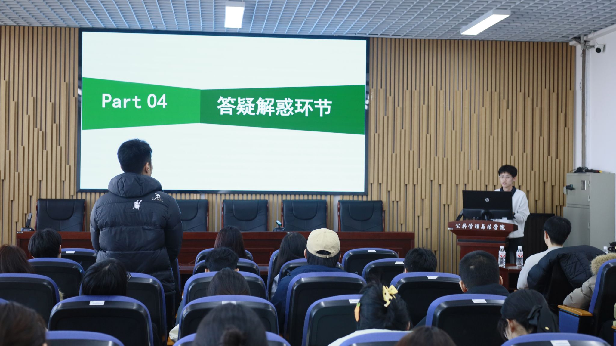 互动答疑环节,现场氛围热烈浓厚。同学们围绕毕业细则疑惑、赛事备赛技巧、论文写作难点等问题踊跃举手提问,两位主讲人结合自身学习与实践经验,逐一耐心回应、精准点拨解惑,切实解决了大家在学业和科研中遇到的实际难题。
