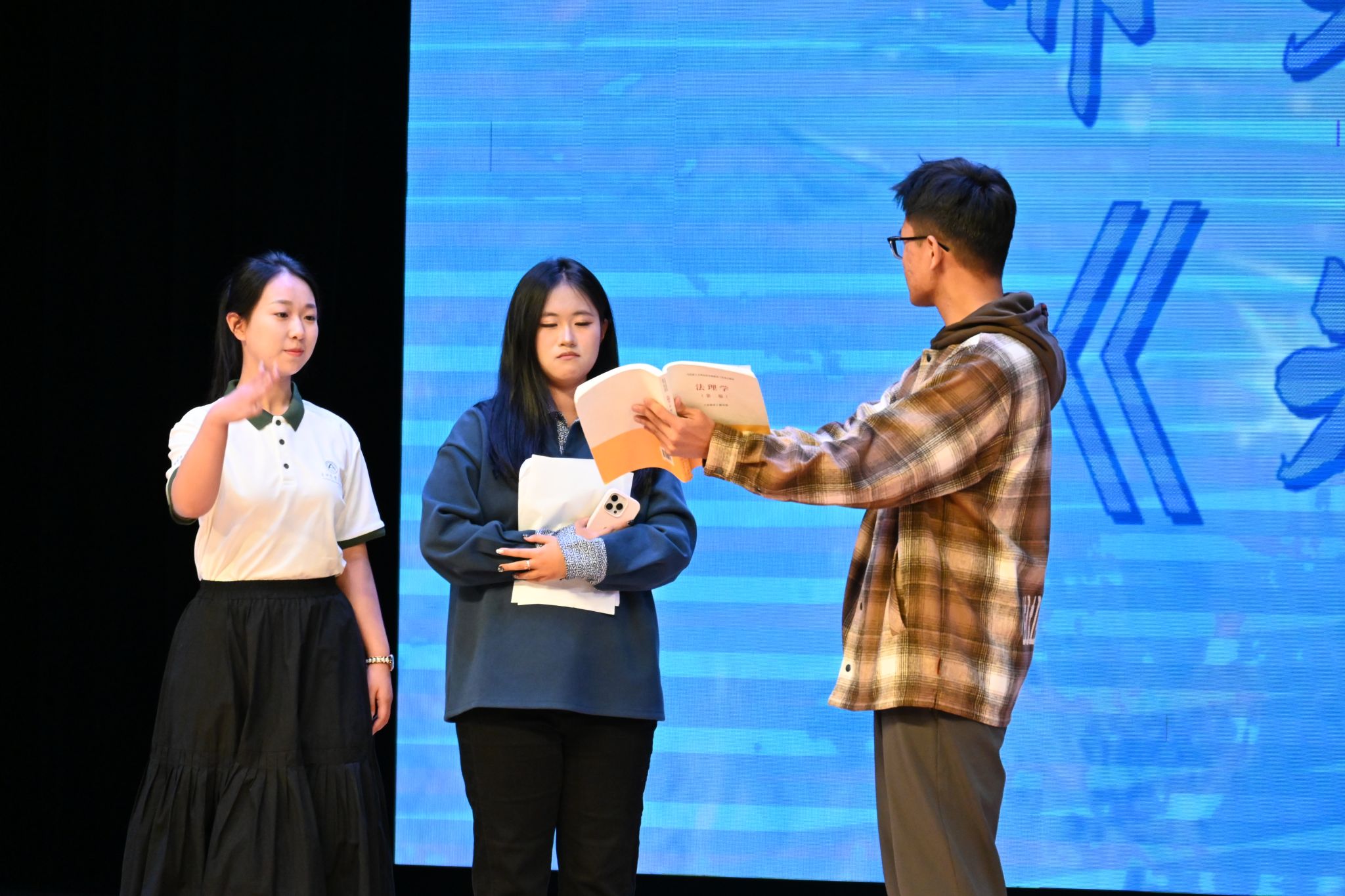 旋律轻起、灯光柔暖,心理剧表演将班会推向情感高潮。同学们以细腻演绎、真挚旁白,搭配悠扬音乐与恰当光影,生动展现青年学子青春征途的迷茫、挣扎与追寻。剧终时全体演员齐唱,星光汇聚成炬,如逆境微光照亮前路。这部关于陪伴、理解与成长的心理剧,以纯粹情感与饱满感染力打动评委观众,赢得阵阵掌声与赞誉。