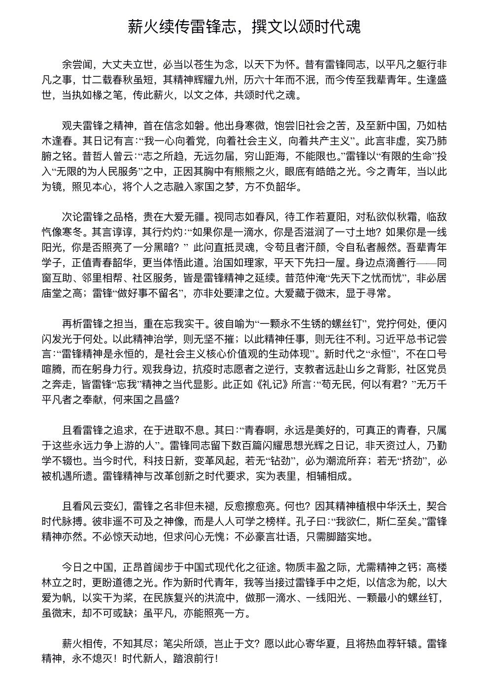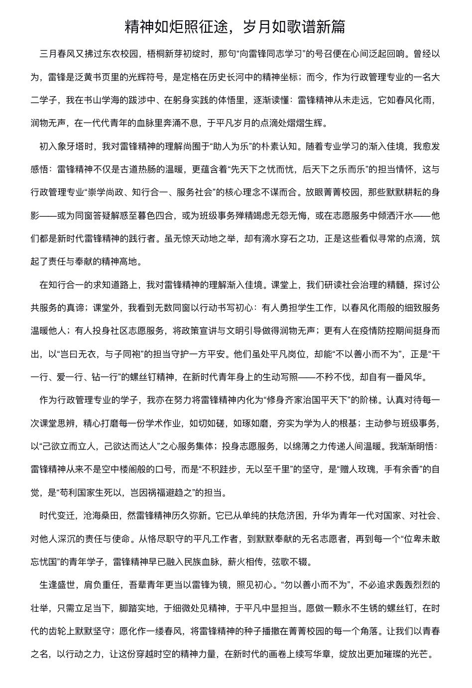 学院学生党务中心同步开展“薪火传雷锋,笔尖颂精神”主题征文,全院本科生踊跃参与。期间共收到征文百余篇,涵盖散文、随笔等多种体裁。同学们以笔墨讲述雷锋故事、诠释雷锋精神内涵,抒发践行之志。活动以文育德、以文铸魂,推动雷锋精神融入校园文化,实现精神薪火相传。