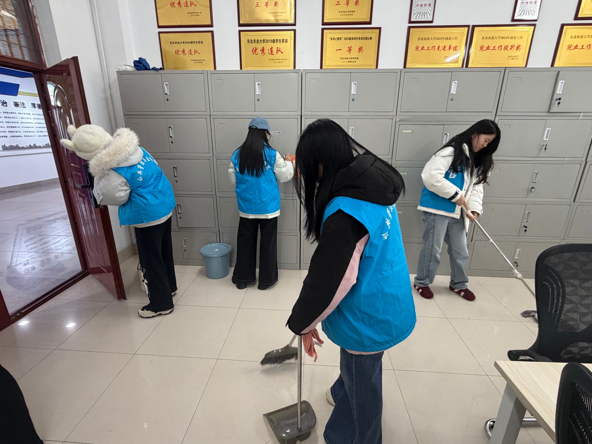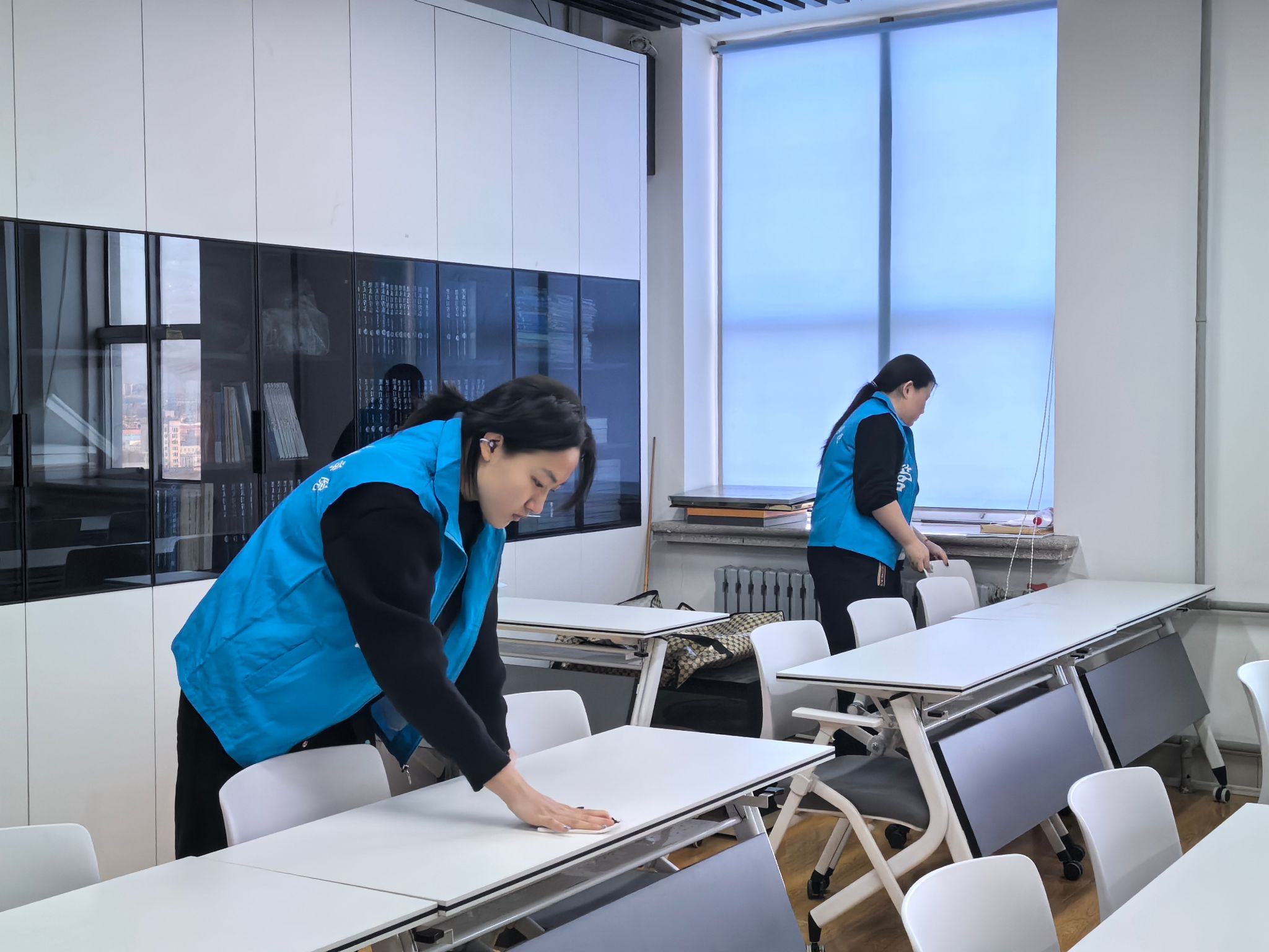 志愿者打扫成栋楼办公室